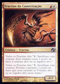 | Fractius da Cauterização Criatura - Fractius Todos os Fractius têm '  , sacrifique esta Permanente: Esta Permanente causa 1 ponto de dano à criatura ou ao jogador alvo.' Todos os Fractius têm '  , sacrifique esta Permanente: Previne o próximo 1 ponto de dano que seria causado à criatura do tipo Fractius ou ao jogador alvo durante este turno.' T1 | |