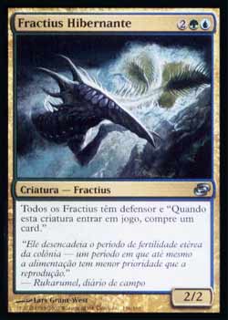| Fractius Hibernante Criatura - Fractius Todas as criaturas do tipo Fractius têm Defensor. Todos os Fractius têm 'Quando esta Permanente entrar no Campo de Batalha, compre um card.' Errata: não confundir com Hibernation Sliver, da série Fortaleza, que também foi traduzido para o português como Fractius Hibernante. T1 | |
