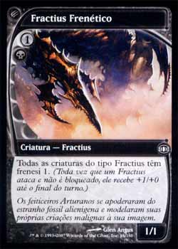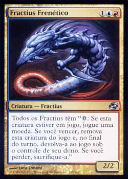 | Fractius Frenético Criatura - Fractius Todas as criaturas do tipo Fractius têm Voar. Todos os Fractius têm '  : Se esta Permanente estiver no Campo de Batalha, lance uma moeda. Se você vencer, Exile esta Permanente e então devolva-a para o Campo de Batalha sob o controle de seu dono No início da próxima Etapa Final. Se você perder, sacrifique esta Permanente.' Errata: não confundir com Frenzy Sliver, da série Visão do Futuro, que também foi traduzido para o português como Fractius Frenético. T1 | |