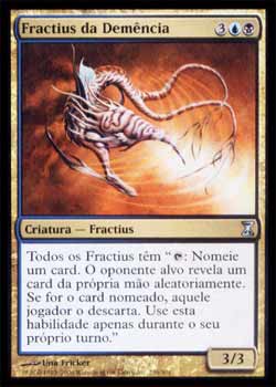 | Fractius da Demência Criatura - Fractius Todos os Fractius têm '  : Nomeie um card. O oponente alvo revela um card aleatoriamente de sua própria mão. Se for o card nomeado, aquele jogador o descarta. Ative esta habilidade apenas durante o seu próprio turno.' T1 | |