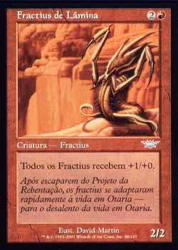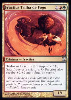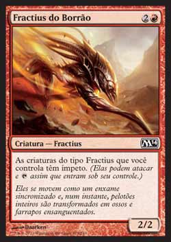 | Fractius Trilha de Fogo Criatura - Fractius Todas as criaturas do tipo Fractius têm Ímpeto. Todos os Fractius têm '  , sacrifique esta Permanente: A criatura alvo do tipo Fractius ganha +2/+2 até o final do turno.' T1 | |