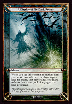 | Sem nome em Português Quando você colocar este Esquema para funcionar, até o seu próximo turno, toda vez que um jogador virar um terreno para adicionar mana, aquele jogador adiciona um mana daquele tipo a sua reserva de mana. T0 | |