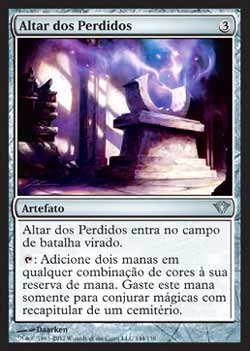 | Altar dos Perdidos Artefato Altar of the Lost entra no Campo de Batalha virado.  : Adiciona dois manas de qualquer combinação de cores a sua reserva. Utilize este mana apenas para Conjurar mágicas com Lampejo de um cemitério. T0 | |