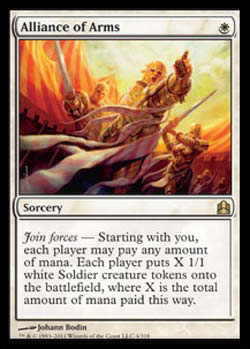 | Sem nome em Português Feitiço Unir Forças - Começando por você, cada jogador pode pagar uma quantidade qualquer de mana. Cada jogador coloca no Campo de Batalha X fichas de criatura branca 1/1 do tipo Soldado, onde X é o total de mana pago desta forma. T0 | |