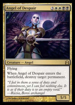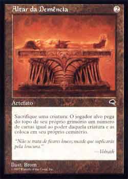 | Altar da Demência Artefato Sacrifique uma criatura: O jogador alvo coloca um número de cards igual ao poder daquela criatura do topo de seu próprio grimório no cemitério de seus donos. T1 | |