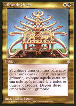 | Altar de Ossos Feitiço Como um custo adicional para Conjurar Altar of Bone, sacrifique uma criatura. Procure em seu grimório por um card de criatura, revele aquele card, e coloque-o em sua mão. Embaralhe seu grimório a seguir., T1 | |