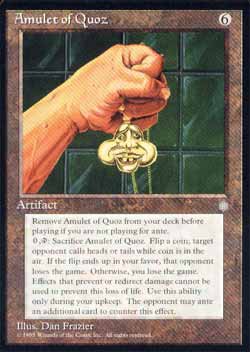 | N/A Artefato Remova Amulet of Quoz de seu baralho antes da partida começar se você não estiver jogando por Ante.  , sacrifique Amulet of Quoz: o oponente alvo pode adicionar o card do topo de seu próprio grimório à Ante. Se ele não o fizer, lance uma moeda. Se você vencer, aquele jogador perde o jogo. Se você perder, você perde o jogo. Ative esta habilidade apenas durante sua Etapa de Manutenção. T1 | |