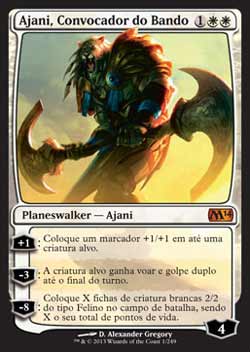 | Ajani, Convocador do Bando +1: Coloque um marcador +1/+1 em até uma criatura alvo. -3: A criatura alvo tem Voar e Golpe Duplo até o final do turno. -8: Coloque no Campo de Batalha X fichas de criatura branca 2/2 do tipo Felino, onde X é seu total de pontos de vida. T0 | |