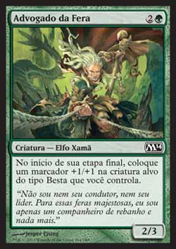 | Advogado da Fera Criatura - Elfo Xamã No início de sua Etapa Final, coloque um marcador +1/+1 na criatura alvo do tipo Besta que você controla. T0 | |