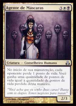 | Agente de Máscaras Criatura - Humano Conselheiro No início de sua Etapa de Manutenção, cada oponente perde 1 ponto de vida. Voce ganha uma quantidade de vida igual ao total de pontos perdidos desta forma. T1 | |