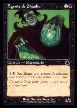 | Agente de Shauku Criatura - Humano Mercenário   , Sacrifique um terreno: A criatura alvo ganha +2/+0 até o final do turno. T1 | |