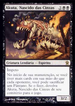 | Akuta, Nascido das Cinzas Ímpeto. No início de sua Etapa de Manutenção, se você tiver mais cards em sua mão do que cada oponente, você pode sacrificar um Pântano para devolver Akuta, Born of Ash de seu cemitério para o Campo de Batalha. T1 | |