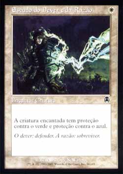 | Escudo do Dever e da Razão Encantar criatura. A criatura encantada tem Proteção contra o verde e Proteção contra o azul. T1 | |