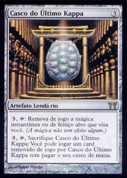 | Casco do Último Kappa  ,  : Exile a Mágica Instantânea alvo ou o feitiço alvo que tenha você como alvo. Aquela mágica não tem efeito.  ,  , sacrifique Shell of the Last Kappa: Você pode Conjurar um card Exilado com Shell of the Last Kappa sem pagar seu custo de mana. T1 | |