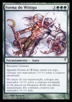 | Forma do Wiitigo Encantar criatura. Quando Shape of the Wiitigo entrar no Campo de Batalha, coloque seis marcadores +1/+1 na criatura encantada. No início de sua Etapa de Manutenção, coloque um marcador +1/+1 na criatura encantada se ela tiver atacado ou bloqueado desde sua Etapa de Manutenção anterior. Caso contrário, remova um marcador +1/+1 da criatura encantada. T1 | |