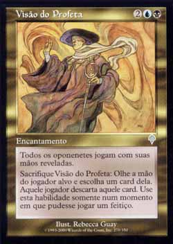 | Visão do Profeta Encantamento Todos os oponentes jogam com suas mãos reveladas. Sacrifique Seer's Vision: Olhe a mão do jogador alvo e escolha um card. Aquele jogador descarta aquele card. Ative esta habilidade apenas quando você puder Conjurar um feitiço. T1 | |