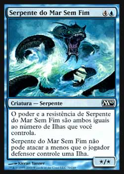 | Serpente do Mar Sem Fim Criatura - Serpente O poder e a resistências de Serpent of the Endless Sea são ambos iguais ao número de Ilhas que você controla. Serpent of the Endless Sea não pode atacar a menos que o jogador defensor controle uma Ilha. T4 | |