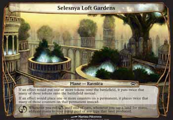 | Sem nome em Português Se um efeito fosse colocar uma ou mais fichas no Campo de Batalha, ao invés disso, aquele efeito colocará o dobro daquela quantidade de fichas. Se um efeito fosse colocar um ou mais marcadores em uma Permanente, ao invés disso, aquele efeito colocará o dobro daqueles marcadores naquela Permanente. Toda vez que você obtiver  no dado, até o final do turno, toda vez que você virar um terreno para adicionar mana, adiciona a sua reserva de mana um mana de qualquer tipo que aquele terreno tenha produzido. T0 | |