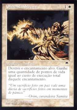 | Oferenda Serena Destrói o encantamento alvo. Você ganha uma quantidade de pontos de vida igual ao Custo de Mana Convertido daquele encantamento. T1 | |