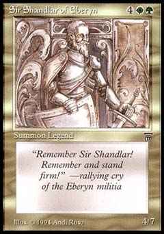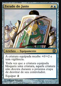 | Escudo do Justo A criatura Equipada ganha +0/+2 e tem Vigilância. Toda vez que a criatura Equipada bloquear uma criatura, aquela criatura bloqueada não desvira durante a próxima Etapa de Desvirar de seu controlador. Equipar  . T4 | |
