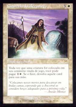 | Chancela do Recomeço Encantamento Toda vez que uma criatura for colocada em seu cemitério vinda do Campo de Batalha, você pode pagar   . Se o fizer, devolva aquele card para sua mão. T1 | |