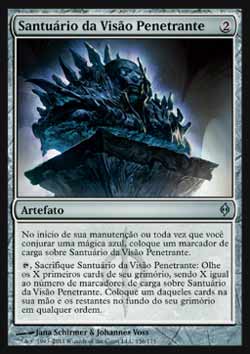 | Santuário da Visão Penetrante Artefato No início de sua Etapa de Manutenção ou toda vez que você Conjurar uma mágica azul, coloque um marcador de carga em Shrine of Piercing Vision.  , sacrifique Shrine of Piercing Vision: Olhe os X cards do topo de seu grimório, onde X é o número de marcadores de carga em Shrine of Piercing Vision. Coloque um daqueles cards em sua mão e o restante no fundo de seu grimório em qualquer ordem. T2 | |
