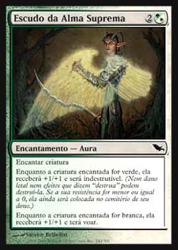 | Escudo da Alma Suprema Encantar Criatura. Enquanto a criatura encantada for verde, ela ganha +1/+1 e é Indestrutível. Enquanto a criatura encantada for branca, ela ganha +1/+1 e tem Voar. T1 | |