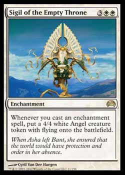 | Insígnia do Trono Vazio Encantamento Toda vez que você Conjurar uma mágica de encantamento, coloque no Campo de Batalha uma ficha de criatura branca 4/4 do tipo Anjo com Voar. T4 | |