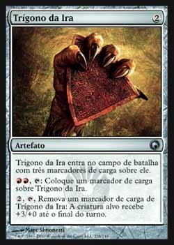 | Trígono da Ira Artefato Trigon of Rage entra no Campo de Batalha com três marcadores de carga.   ,  : Coloque um marcador de carga em Trigon of Rage.  ,  , Remova um marcador de carga de Trigon of Rage: A criatura alvo ganha +3/+0 até o final do turno. T2 | |