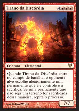 | Tirano da Discórdia Criatura - Elemental Quando Tyrant of Discord entrar no Campo de Batalha, o oponente alvo escolhe aleatoriamente uma Permanente que ele próprio controla e a sacrifica. Se uma Permanente que não seja um terreno for sacrificada desta forma, repita este processo. T0 | |