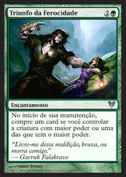 | Triunfo da Ferocidade Encantamento No início de sua Etapa de Manutenção, compre um card se você controlar a criatura com o maior poder ou que estiver empatada com o maior poder. T0 | |