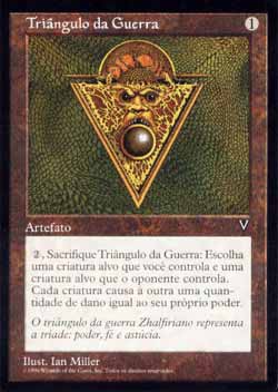 | Triângulo da Guerra Artefato  , sacrifique Triangle of War: Escolha uma criatura alvo que você controla e uma criatura alvo que um oponente controla. Aquelas criaturas Lutam uma contra a outra. T1 | |