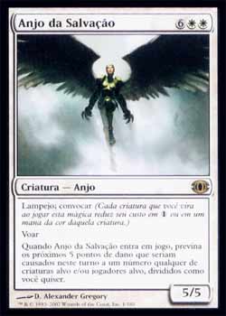 | Nome em Inglês: | Angel of Salvation | | Nome em Português: | Anjo da Salvação | | Custo de Mana: |    | | Tipo: | Criatura - Anjo | | Texto: | Lampejo. Convocar. Voar. Quando Angel of Salvation entrar no Campo de Batalha, previne os próximos 5 pontos de dano que seriam causados durante este turno a qualquer número de jogadores e/ou criaturas alvo, divididos da forma como você quiser. | | P/T: | 5/5 | | Série: |  | | Outras: | | | Raridade: | Raro | | Card: | 001 |