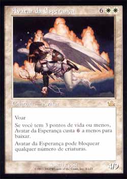 | Nome em Inglês: | Avatar of Hope | | Nome em Português: | Avatar da Esperança | | Custo de Mana: |    | | Tipo: | Criatura - Avatar | | Texto: | Voar. se você tiver 3 pontos de vida ou menos, Avatar of Hope custa a menos para ser Conjurado. Avatar of Hope pode bloquear qualquer número de criaturas. | | P/T: | 4/9 | | Série: |  | | Outras: | | | Raridade: | Raro | | Card: | 003 |
