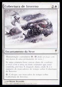 | Nome em Inglês: | Cover of Winter | | Nome em Português: | Cobertura de Inverno | | Custo de Mana: |   | | Tipo: | Encantamento da Neve | | Texto: | Manutenção Cumulativa . Se uma criatura fosse causar dano de combate a você e/ou a uma ou mais criaturas que você controla, previne X daqueles pontos de dano, onde X é o número de marcadores de idade em Cover of Winter.