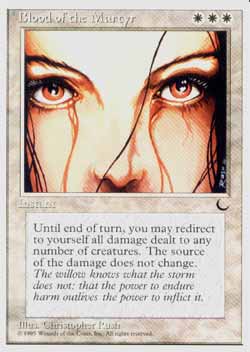| Nome em Inglês: | Blood of the Martyr | | Nome em Português: | Sem nome em Português | | Custo de Mana: |    | | Tipo: | Mágica Instantânea | | Texto: | Até o final do turno, se dano fosse ser causado a qualquer criatura, você pode fazer com que aquele dano seja causado a você ao invés. | | Série: |  | | Outras: | | | Raridade: | Incomum | | Card: | 004 |