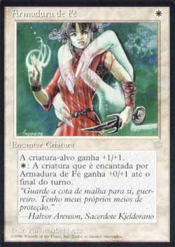 | Nome em Inglês: | Armor of Faith | | Nome em Português: | Armadura de Fé | | Custo de Mana: |  | | Tipo: | Encantamento - Aura | | Texto: | Encantar criatura. A criatura encantada ganha +1/+1.