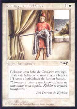 | Nome em Inglês: | Errand of Duty | | Nome em Português: | Mensageiro do Dever | | Custo de Mana: |   | | Tipo: | Mágica Instantânea | | Texto: | Coloque no Campo de Batalha uma ficha de criatura branca 1/1 do tipo Cavaleiro com Formar Bando. | | Série: |  | | Outras: | | | Raridade: | Comum | | Card: | 004 |