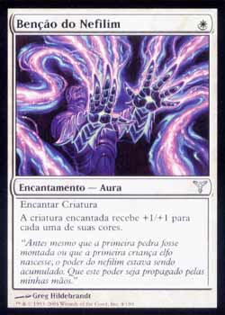 | Nome em Inglês: | Blessing of the Nephilim | | Nome em Português: | Benção do Nefilim | | Custo de Mana: |  | | Tipo: | Encantamento - Aura | | Texto: | Encantar criatura. A criatura encantada ganha +1/+1 para cada uma de suas cores. | | Série: |  | | Raridade: | Incomum | | Card: | 004 |
