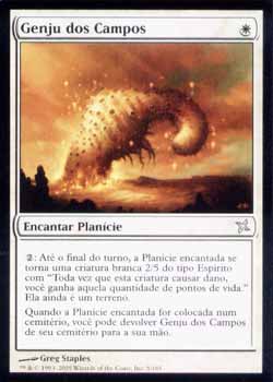 : Até o final do turno, a Planície encantada torna-se uma criatura branca 2/5 do tipo Espírito com Vínculo com a Vida. Aquela Planície ainda é um terreno. Quando a Planície encantada for colocada em um cemitério, você pode devolver Genju of the Fields de seu cemitério para sua mão. |
