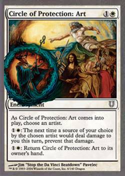 | Nome em Inglês: | Circle of Protection: Art | | Nome em Português: | Sem nome em Português | | Custo de Mana: |   | | Tipo: | Encantamento | | Texto: | Conforme Circle of Protection: Art entra no Campo de Batalha, escolha um artista.