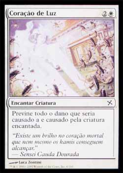 | Nome em Inglês: | Heart of Light | | Nome em Português: | Coração de Luz | | Custo de Mana: |   | | Tipo: | Encantamento - Aura | | Texto: | Encantar criatura. Previne todo o dano que seria causado à criatura encantada e pela criatura encantada. | | Série: |  | | Outras: | | | Raridade: | Comum | | Card: | 006 |
