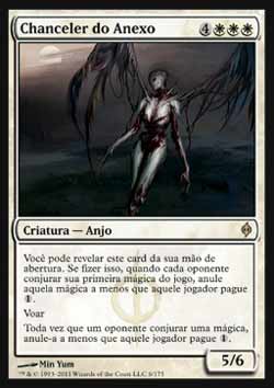 | Nome em Inglês: | Chancellor of the Annex | | Nome em Português: | Chanceler do Anexo | | Custo de Mana: |     | | Tipo: | Criatura - Anjo | | Texto: | Você pode revelar este card de sua mão inicial. Se o fizer, quando cada oponente Conjurar sua primeira mágica no jogo, anule-a a menos que aquele jogador pague . Voar. Toda vez que um oponente Conjurar uma mágica, anule-a a menos que aquele jogador pague . | | P/T: | 5/6 | | Série: |  | | Raridade: | Raro | | Card: | 006 |