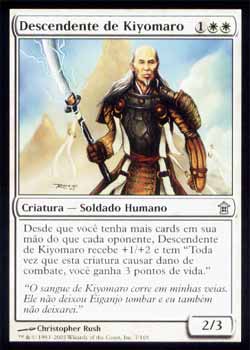 | Nome em Inglês: | Descendant of Kiyomaro | | Nome em Português: | Descendente de Kiyomaro | | Custo de Mana: |    | | Tipo: | Criatura - Humano Soldado | | Texto: | Enquanto você tiver mais cards em sua mão do que cada oponente, Descendant of Kiyomaro ganha +1/+2 e tem 'Toda vez que esta criatura causar dano de combate, você ganha 3 pontos de vida.' | | P/T: | 2/3 | | Série: |  | | Raridade: | Incomum | | Card: | 007 |