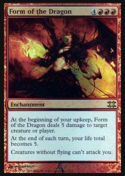| Nome em Inglês: | Form of the Dragon | | Nome em Português: | Sem nome em Português | | Custo de Mana: |     | | Tipo: | Encantamento | | Texto: | No início de sua Etapa de Manutenção, Form of the Dragon causa 5 pontos de dano à criatura ou ao jogador alvo. No final de cada turno, seu total de pontos de vida torna-se 5. Criaturas sem Voar não podem atacar você. | | Série: |  | | Outras: | | | Raridade: | Raro | | Card: | 007 |