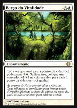 | Nome em Inglês: | Cradle of Vitality | | Nome em Português: | Berço da Vitalidade | | Custo de Mana: |   | | Tipo: | Encantamento | | Texto: | Toda vez que você ganha pontos de vida, você pode pagar  . Se o fizer, coloque um marcador +1/+1 em uma criatura alvo para cada 1 ponto de vida que você ganhou. | | Série: |  | | Outras: | | | Raridade: | Raro | | Card: | 007 |