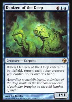 | Nome em Inglês: | Denizen of the Deep | | Nome em Português: | Sem nome em Português | | Custo de Mana: |    | | Tipo: | Criatura - Serpente | | Texto: | Quando Denizen of the Deep entrar no Campo de Batalha, devolva todas as outras criaturas que você controla para as mãos de seus donos. | | P/T: | 11/11 | | Série: |  | | Outras: | | | Raridade: | Raro | | Card: | 007 |