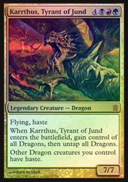 | Nome em Inglês: | Karrthus, Tyrant of Jund | | Nome em Português: | Sem nome em Português | | Custo de Mana: |     | | Tipo: | Criatura Lendária - Dragão | | Texto: | Voar, Ímpeto. Quando Karrthus, Tyrant of Jund entrar no Campo de Batalha, ganhe o controle de todos os Dragões, então desvira todos os Dragões. Outras criaturas do tipo Dragão que você controla têm Ímpeto. | | P/T: | 7/7 | | Série: |  | | Outras: | | | Raridade: | Mítico Raro | | Card: | 007 |
