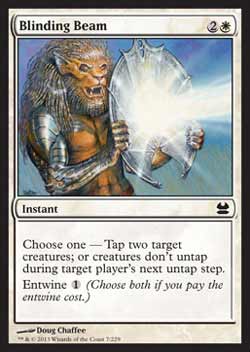 | Nome em Inglês: | Blinding Beam | | Nome em Português: | Sem nome em Português | | Custo de Mana: |   | | Tipo: | Mágica Instantânea | | Texto: | Escolha uma - vire duas criaturas alvo; ou as criaturas não desviram durante a próxima Etapa de Desvirar do jogador alvo. Entrelaçar . | | Série: |  | | Outras: | | | Raridade: | Comum | | Card: | 007 |