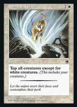 | Nome em Inglês: | Blinding Light | | Nome em Português: | Sem nome em Português | | Custo de Mana: |   | | Tipo: | Feitiço | | Texto: | Vire todas as criaturas que não sejam brancas. | | Série: |  | | Outras: | | | Raridade: | Raro | | Card: | 008 |